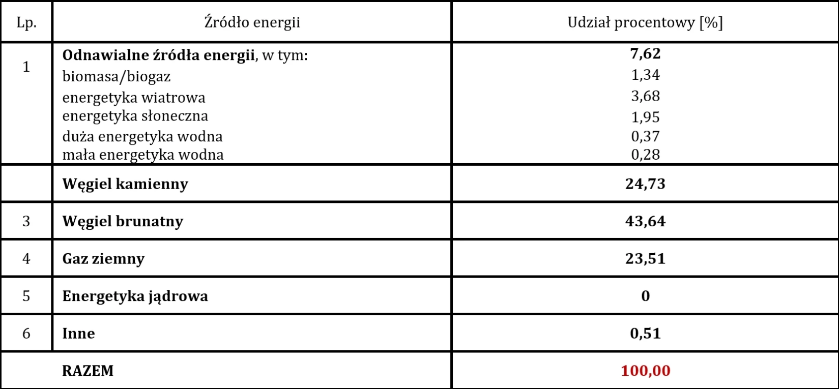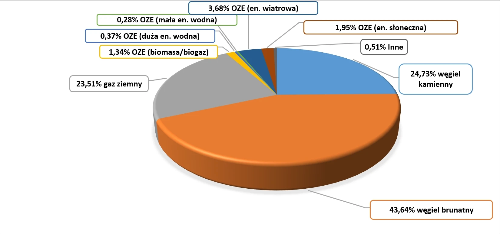 1) Struktura paliw zużytych do wytworzenia energii elektrycznej zakupionej na giełdach energii elektrycznej oraz na rynku bilansującym opracowana została na podstawie danych o produkcji energii elektrycznej, Tab. 5.2, Informacja statystyczna o energii elektrycznej – Agencja Rynku Energii SA, Biuletyn Miesięczny Nr 12 (384) GRUDZIEŃ 2025.